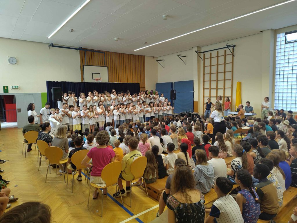 Wie jedes Jahr fand kurz vor Beginn der Herbstferien unser traditionelles Ferienbeginnkonzert in der Turnhalle statt. Alle Kinder, Lehrerinnen und Lehrer sowie Mitarbeitende der Schule kamen zusammen, um die ersten Schulwochen musikalisch ausklingen zu lassen. Auch dieses Mal hatten wieder viele engagierte Eltern die Bühne aufgebaut und die Turnhalle vorbereitet. Unsere … Ferienbeginnkonzert zum Herbst weiterlesen - Tadaa bringt herbstliche Töne und Lieder in unseren Singsaal