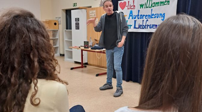 Stefan Gemmel stellte sein Buch „Befreiungsschlag“ vor. Es war ein spannender, interaktiver Abend. Es gab sehr viel zu erzählen, und besonders schön zu beobachten war, wie sehr sich die 19 Jugendlichen nach so langer Zeit über das Wiedersehen in ihrer alten Grundschule freuten.